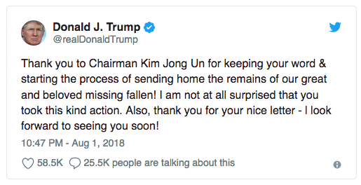 Mr. Trump thanked North Korean leader Kim Jong Un for the return of the fallen soldiers last week.