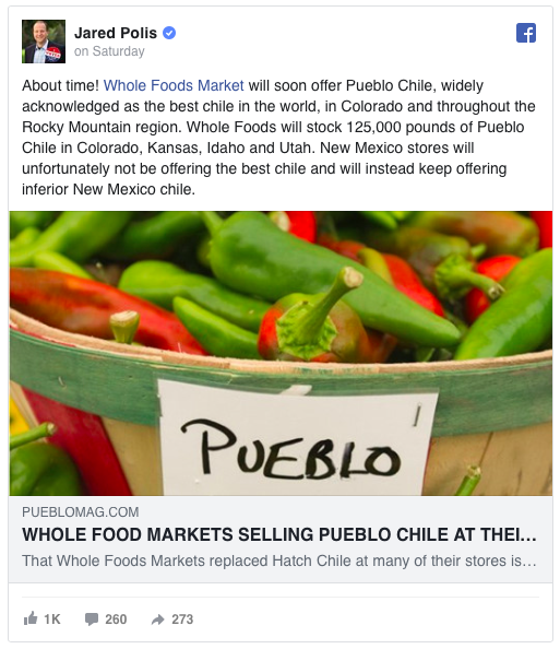 “About time! Whole Foods Market will soon offer Pueblo Chile, widely acknowledged as the best chile in the world, in Colorado and throughout the Rocky Mountain region,” the governor wrote. “… New Mexico stores will unfortunately not be offering the best chile and will instead keep offering inferior New Mexico chile.”