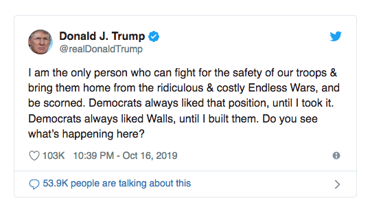 On Thursday, Trump vented about Democratic criticism. “I am the only person who can fight for the safety of our troops & bring them home from the ridiculous & costly Endless Wars, and be scorned. Democrats always liked that position, until I took it,” he said.