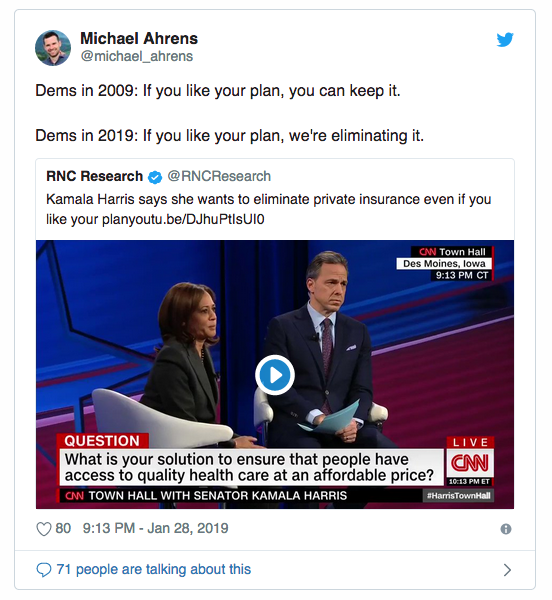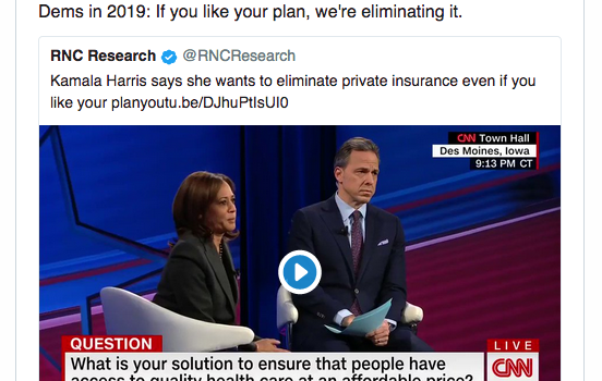 It was an answer that Republicans immediately jumped on. Michael Ahrens, rapid response director for the Republican National Committee, said on Twitter, “Dems in 2019: If you like your plan, we’re eliminating it.”